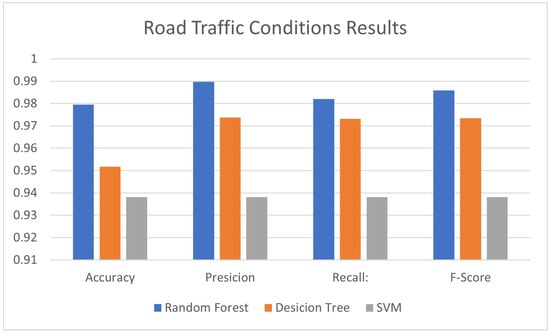 Accuracy, precision, recall and F-score for road traffic conditions results.