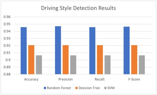 Table 10 shows the feature importance for driving style classification. Fuel consumption was more important for decision trees and random forests, while manifold air pressure was more important for SVM.
