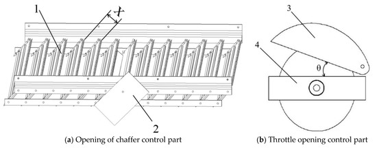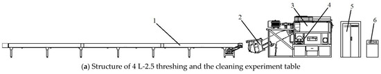 14] undertook a bench optimization test on the main operating parameters (feed rate, air door opening, fan speed, and angle of upper and lower air guide plates) of a double outlet, multi-air duct cleaning device. Those authors studied the influence of these factors on the cleaning loss rate, impurity content rate, and secondary impurity content rate, determining the optimal parameter combination thereof. A response surface bench test was carried out with the mass fraction of grains, stems, and sundries in the total mass of the desorbed matter of a double desorber as the test index. Feed rate, the opening of the air door, fan speed and the angle of the upper and lower air guide plates were used as test factors. The influences of these factors on the test index were analyzed, and the best matching parameters were obtained, serving as a reference for the study of the harvester’s performance and the structural design of a multi air channel cleaning device. Li et al. [