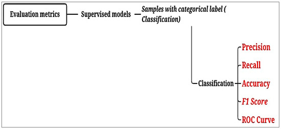 AI predictive models can be supervised when the input data is known (labelled) or unsupervised when the ML algorithm is not telling the input data’s meaning. The input data for this study are labelled. Thus, supervised models were applied to classify the data. The models aim to identify the class (target) an object (characteristics) belongs by mapping the input variables into distinct categories, such as the most important characteristics (clinical symptoms), thus determining the group or class to which the data belongs within the business context. Figure 1 presents the evaluation metrics used in the data classification task that are analysed in this study.