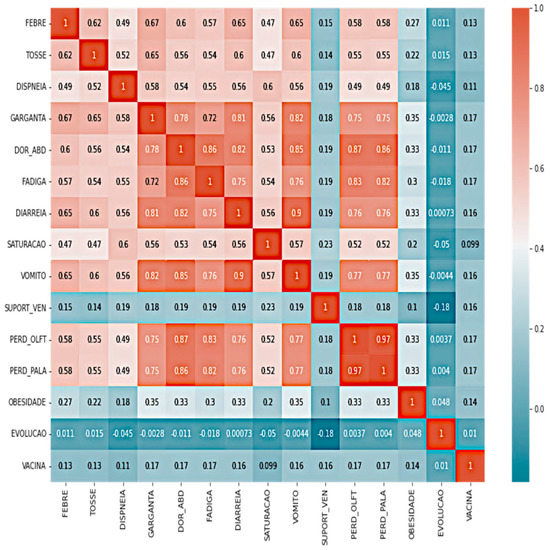 Table 3 presents a negative linear relationship between the attributes EVOLUCAO and SUPPORT_VEN. Indeed, as the value of EVOLUTION goes from 1—Cure to 2—Death, the value of SUPPORT_VEN decreases from 2—Use of noninvasive ventilatory support) to 1—Use of invasive ventilatory support), thus demonstrating a relationship between invasive ventilatory support and death cases. In this study, attributes with high correlation were used, as they have the most significant predictive capacity (sign), and irrelevant variables (low correlation) were excluded.