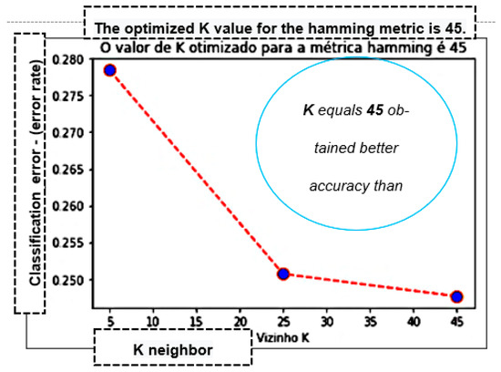The value of K equal to 45, as shown in Figure 4, using the Hamming distance measure, was the configuration with the best overall performance (accuracy), obtaining 75.27% confidence in the estimate. Its execution time was 69.995 s, the fastest execution using Euclidean distance and K equal to 5, taking 7.132 s, but it was the least accurate among the analysed K values.