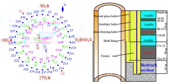 According to the bidding documents, the freezing depth is determined to be 305 m. Based on the well wall structure diagram and the geological data of the well inspection holes provided in the bidding documents, after the optimization of the plan, the comprehensive freezing construction scheme is adopted in the Dongfeng Well, where the main freezing holes, auxiliary freezing holes, and prevent piece holes are operated together with the three circles of holes. The differential freezing scheme is employed in the main freezing holes, while the “plum blossom pile” arrangement is adopted for the auxiliary and prevent piece holes. To monitor the real-time development of the freezing temperature field, temperature measurement holes (C1–C3) and hydrological holes (S1–S2) are set in the freezing area. Among them, the S1 hole (hole depth: 40 m) is designed with four flower tube parts at a depth of 6.5–11.5, 25.5–30.5, 31.5–33, and 35.0–39.0 m. A partition at a vertical depth of 25 m is established, and the casing is lowered to obtain the change in the water level layer by layer (the casing size is Φ38 × 3.5 mm). For S2 hole (depth: 125 m), a flower tube at a position of 118.0–123.0 m is designed. The parameters of the freezing holes are listed in Table 1, and their layout and cross-section are shown in Figure 1. Based on the depth of the wellbore alluvial layer and the control formation (−216 m sandy clay), combined with the relevant specification [26], the brine temperature during the active freezing period is determined to be −25 to −30 °C. The average design temperature of the effective frozen wall of the Neogene control horizon (−216.45 m sandy clay) is −12 °C, and the design thickness is calculated with Domke formula [31].