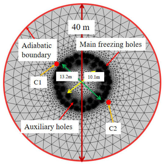 A circular domain with a radius of 20 m is taken as the solution area of the model, and a numerical calculation model is established based on the actual positions of hole formation on site. The mesh division and geometric size of the model are shown in Figure 2.