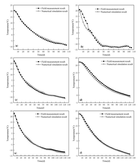 Based on the measured data of on-site temperature measurement points, the parameters in the numerical calculation model are adjusted using the soil thermophysical parameters measured in the laboratory. The parameters of the numerical calculation model are shown in Table 2.