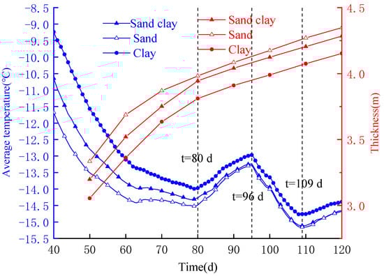 The effective frozen wall represents the original frozen wall in each layer of this study minus part of frozen soil removed by shaft excavation and the retained frozen wall. Due to the random deflection of the freezing holes, the thickness of the frozen wall in different directions is not uniform, so the thickness in four different directions is taken in this study, and the average thickness of the four directions is taken as the research index of the frozen wall thickness. The average temperature of the frozen wall is the weighted average of the temperature in its area. By extracting the effective frozen wall thickness and average temperature data from the numerical model, the variation in the effective frozen wall thickness and average temperature with time is obtained, as shown in Figure 6.