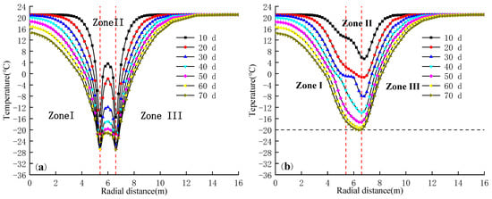 The temperature data on the main surface and interface at different times in the temperature field were extracted, and the obtained radial temperature distribution of the frozen wall at the main surface and interface in different soil layers is shown in Figure 7. According to the freezing holes, the temperature field of frozen wall can be divided into three zones: zone I, zone II, and zone III. Under the same freezing time, the cooling in zone II is the fastest, followed by that in zone I and zone III. This is because during the freezing process, there is no external heat supply in zone II, and this area is also affected by the superposition of cooling capacity of auxiliary holes and main freezing holes. Although zone I is less affected by the superposition of cooling capacity of double-loop pipes during the freezing process, there is no external source to supplement heat in this zone. The freezing process of zone III is not affected by the superposition of the cooling capacity of the double-ring freezing holes, and the surrounding soil with constant ground temperature can be used as an external source to supplement heat for the soil in the zone. During the freezing process, the closer the region to the freezing hole, the faster the cooling. At the same layer and under the same freezing time, the temperature at the main surface of the frozen wall is obviously lower than that at the interface. When frozen for 70 d, the minimum temperature of the main surface is approximately 7 °C lower than that of the interface. In the same layer, during the later stage of freezing, the lowest temperature on the main surface is always observed at the frozen hole, while on the interface, due to the random deflection of the freezing holes, the lowest temperature is located at a certain position between the two circles of freezing holes. For different soil layers, regardless of the main surface or interface, under the same freezing time, the cooling of fine sand is the fastest, followed by that of sandy clay, and clay layer has the slowest cooling. When frozen for 70 d, the minimum temperature of the fine sand layer is 0.5 and 1 °C lower than that of the sandy clay layer and clay layer, respectively. In the case of deflection of the freezing holes, the temperature field distribution of the main surface is symmetric; especially, the soil temperature field in the II zone has high symmetry. However, the temperature field at the interface is not symmetrical.