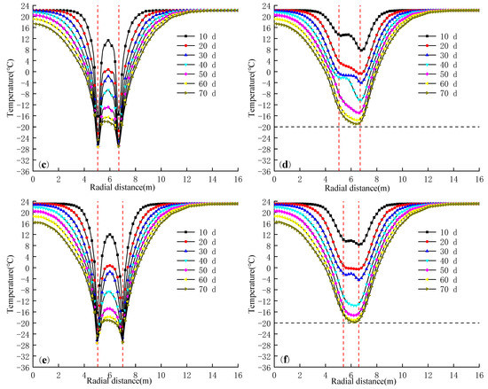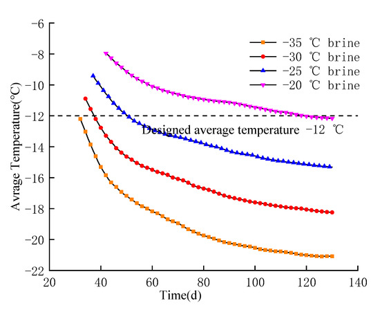 It can be seen from Figure 6 that the average temperature of the frozen wall can be roughly divided into five stages. The first stage is from 40 to 60 d, during which the average temperature of the frozen wall decreases rapidly with the freezing time. The second stage is from 60 to 80 d; during this period, the average temperature of the frozen wall decreases slightly with the freezing time and generally remains stable. The average temperature of the frozen wall increases with the freezing time from 80 to 96 d, and it decreases with the freezing time from 96 to 109 d. It again increases with the freezing time from 109 to 120 d. The freezing process can be divided into active freezing period and maintenance freezing period. After the on-site freezing begins, the freezing unit pumps the continuously cooled brine through the circulation system to the freezing pipe embedded in the soil. By circulating the cold brine to cool the formation, the water in the formation is frozen, and a closed frozen wall is formed around the working face to resist the water and soil pressure from the formation. According to the brine temperature measured on site, after freezing for 20 to 30 d, the brine temperature in the main freezing holes and auxiliary holes reaches the designed low temperature level. Further, the brine temperature remains basically stable and then enters the active freezing stage (80 d before freezing).