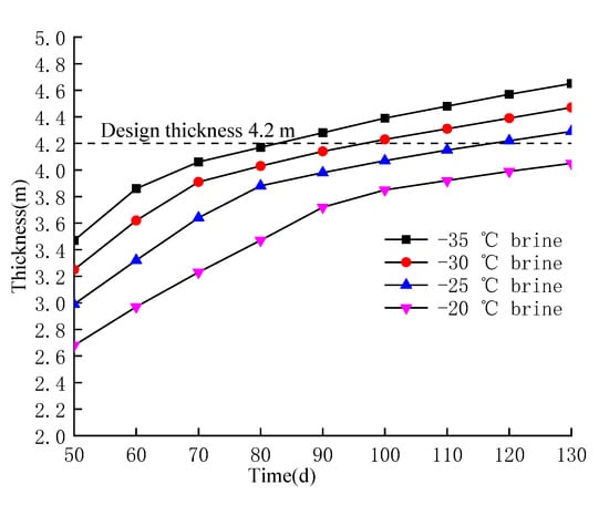 The temperature of circulating cooling agent (brine) governs the formation of frozen wall. Here, −216 m sandy clay layer control is taken as the research object, and based on the actual position of the freezing holes, the active freezing period under different brine temperatures as well as the variations in the characteristic parameters of the temperature field of the frozen wall (effective frozen wall average temperature, effective thickness of frozen wall) with time are examined. The brine temperature in the active freezing period is −20, −25, −30, and −35 °C. It is assumed that the on-site circulating brine temperature for the first 19 d is the same as that in the actual project, and the brine temperature of the freezing holes remains unchanged after the 20th day of brine circulation. As shown in Figure 8 and Figure 9, the variation in the brine temperature during the active freezing period affects the average temperature and thickness. Under the same freezing time, the lower the brine temperature, the lower the effective frozen wall temperature and the greater the thickness. When frozen for 130 d, the brine temperature decreases from −20 and −35 °C, and the average temperature of effective frozen wall decreases from −12.16 to −21.09 °C, corresponding to a decrease of 73.4%. Under freezing for 130 d, the effective frozen wall thickness increases from 4.05 m to 4.65 m, which corresponds to an increase of 14.8%. For the sandy clay layer at the control horizon of topsoil (−216 m), during excavation (frozen for 130 d), the designed average temperature of effective frozen wall is −12 °C, and the designed thickness is 4.2 m. If the brine temperature in the active freezing period is −20 °C, the average temperature of the effective frozen wall just reaches −12 °C during the excavation of this layer, but the thickness cannot reach the design requirement of 4.2 m. Therefore, the salt water temperature in the active freezing period is −20 °C, which cannot meet the design requirements. If the brine temperature during the active freezing period is set to −25 °C or below, as shown in Figure 8 and Figure 9, the average temperature and thickness of effective frozen wall during the excavation of the control layer meet the design requirements. Therefore, the brine temperature during the active freezing period is set to −25 °C or below. It can be seen from Figure 8 and Figure 9 that when the brine temperature is −25 °C and below, the average temperature of effective frozen wall reaches −15 to −21 °C and the thickness is 4.29–4.65 m when frozen for 130 d; under the premise of ensuring safety, this can avoid increasing the difficulty in excavation due to the entry of excessive frozen soil in the excavation section as well as save the freezing costs. Therefore, after entering the maintenance freezing period, the brine temperature in the freezing hole should be adjusted in real-time while maintaining the average temperature and thickness of the effective frozen wall. According to Figure 3, the brine temperature during the active freezing period is −25 to −27 °C. The brine temperature of the main freezing holes remains unchanged after freezing for 80 days, and the brine temperature of auxiliary holes is controlled, which ensures the thickness of the effective frozen wall, reduces the expansion of frozen soil into the excavation section, decreases the difficulty in excavation, and saves freezing cost. Therefore, the theoretical analysis is consistent with the engineering practice.