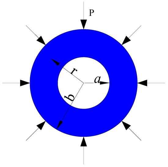 After shaft excavation, the frozen wall, as a temporary support structure, resists the soil-water pressure in the stratum, and its safety is necessary for the personnel security and working face construction progress. The frozen wall after excavation should have sufficient bearing capacity to resist the external load of the frozen wall (which can be considered as permanent horizontal ground pressure acting on the outer frozen wall). At the same time, as the frozen wall is a rheological material, to ensure its stability during the period without support after excavation, its creep deformation should meet certain requirements. The stress–strain relationship and deformation of the frozen wall are related to the physical and mechanical parameters of the material, and these parameters are directly determined by the negative temperature level of the frozen wall. Therefore, in this study, the security of the frozen wall is evaluated in terms of the temperature field and stability of the frozen wall. The frozen wall of the control horizon of the topsoil of Qingdong Mine −216 m sandy clay horizon after excavation is selected for analysis. When frozen for 131 d, the soil of this layer is excavated, the excavation radius a = 4.053 m, the frozen wall radius b = 8.403 m, and the horizontal ground pressure borne by the frozen wall is P, MPa. The horizontal ground pressure P = 0.013 H [31], where H is the buried depth, m. The horizontal pressure P = 2.81 MPa in the control horizon. The mechanical model of the frozen wall is shown in Figure 10.