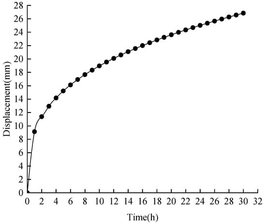 The creep test parameters can be determined according to the creep test of frozen soil under uniaxial compression: A = 0.00195, B = 1.591, and C = 0.317. Substituting r = a = 4.053 m, b = 8.403 m, P = 2.81 MPa, and the values of A, B, and C into Equation (30), the variation in the side-wall displacement with time can be obtained, as shown in Figure 12. It is evident that when the shaft wall is exposed for 30 h, its displacement is 26.85 mm. According to the Coal Mine Technical specification for vertical shaft Sinking by Freezing Method: MT/T1124-2011, in the thick clay layer with buried depth greater than 200 m, the exposure time of the shaft wall is limited to 30 h, and the maximum radial displacement of the shaft wall is not more than 50 mm. Therefore, the displacement of the frozen wall meets the requirements of the code and it is in a safe stable state.