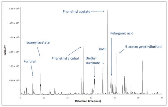 The presence of furanic compounds in balsamic vinegars is associated with the heating of glucose solutions. Furans are generally formed by Maillard reactions between reducing sugars and amino acids, but they can also come from oak barrels, or from the addition of caramel as a frequently used food colorant. The importance of these analytes lies in identifying the organoleptic properties of the products and the possible commercial fraud [10,20,39]. The major furans in balsamic vinegars include hydroxymethylfurfural (HMF), furfural, and 5-acetoxymethylfurfural, with some studies reporting dominance of HMF (Figure 5) and others 5-acetoxymethylfurfural. Other frequently identified furans are 5-methylfurfural and 2-acetylfuran [10,38,39].