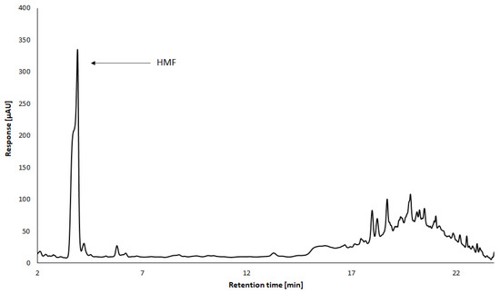Analysis of HMF in TBV by HPLC-DAD method. Conditions: Luna Omega 3 µm Polar C18 100 column, mobile phase acetonitrile/water gradient (M. Kašpar, 2022, unpublished data).