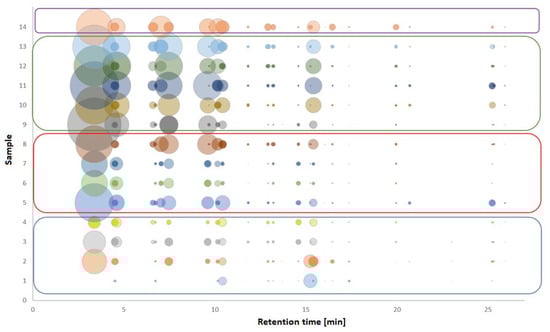 Comparison of the phenolic profile of balsamic vinegar samples obtained by HPLC analysis. Blue box—Greek balsamic vinegar; Red box—BVM; Green box—“premium” BVM; Purple box—TBVM. The first compound is gallic acid. Figure adapted from [96].