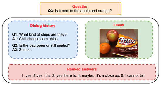 To answer a question correctly and accurately, the AI agent first browses the dialog history to identify passages related to the question. Then, it locates the specific visual objects that match the explicit semantic intent of the question. Figure 1 shows an example of the visual dialog task, to predict the correct answer for the current question Q3, “Is it next to the apple and orange?”, the agent traces the dialog history to obtain clues about the meaning of “it”. In this case, “it” refers to a “bag”, as mentioned in the Q2–A2 pairing. The agent must also determine if there are any mentions of the words “apple” and “orange”. Then, it grounds these entities in the image. For this to work, the agent must comprehensively understand the current question and the past question–answer pairs. In this case, the agent learns that the spatial relationship should be correctly inferred between “it” and the apple and orange fruits pictured.