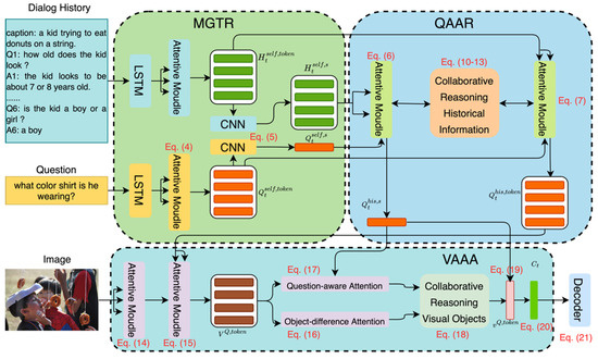 - Guo, D.; Xu, C.; Tao, D. Image-Question-Answer Synergistic Network for Visual Dialog. In Proceedings of the 2019 IEEE/CVF Conference on Computer Vision and Pattern Recognition (CVPR), Long Beach, CA, USA, 15–20 June 2019; IEEE: Piscataway, NJ, USA, 2019; pp. 10426–10435. [Google Scholar]
