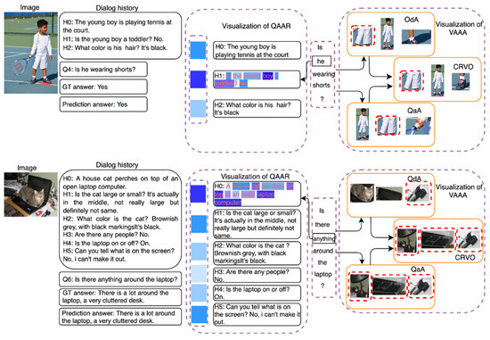 To further demonstrate the good interpretability of our model, we visualized the attention weights generated by QAAR and VAAA modules through the examples illustrated in Figure 4. For the QAAR module, two types of attention weights were shown. The first was attention weights for rounds of dialog history, obtained by modifying with the assistance of (as in Equation (12)). Doing so revealed the relevance of different dialog history rounds. The second was over all tokens in the (selected by ) round of dialog history based on their relationship to the current question, where . That is, reveals the relevance of different tokens in the round of dialog history to the token in the current question. Importantly, for both types of attention, we fetched the average attention weight over all heads computed by the topmost stacked transformer block. For the VAAA module, we first visualized the object-difference attention ( in Equation (16)) and question-aware attention ( in Equation (17)), and visualized the collaborative reasoning attention (in Equation (18)) computed by CRVO. Here, we display the top three ranked visual objects for each attention in the rightmost column of Figure 4.