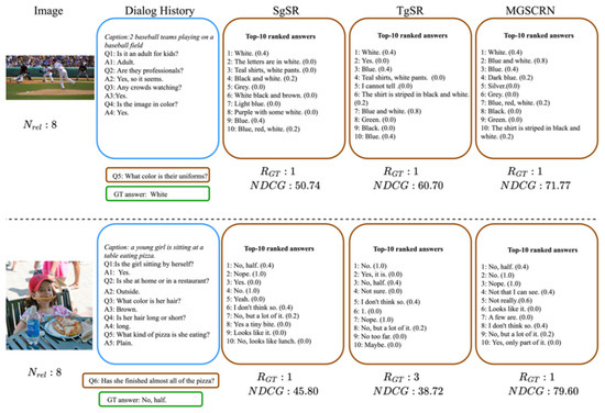 Example results from the validation set of VisDial v1.0 using the SgSR, TgSR, and MGSCRN models. The scores of the top 10 ranked answers are shown in brackets indicating the degree of relevance of the candidate answer options (out of 100) to the question. Here, denotes the rank of GT answer, NDCG is a score ranking of all relevant answers for the question, and is the number of candidate answer options with non-zero relevance.