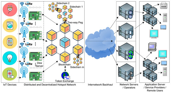 This layer is the most important layer of this architecture. The idea behind this layer is related to the commonly known People Powered Network (PPN), which is similar to that which the Helium Society has developed. The goal of this layer is to enable secure IoT data transmission over the distributed hotspot network access mechanism [95,96]. The term “people” is used here because the hotspots can be used by any person who wants to provide IoT data transmissions in their hotspot coverage area. Typically, the range of IEEE 802.11n (2.4 GHz) Wi-Fi is about 50 m. However, some long-range Wi-Fi devices are becoming available, which can operate on higher GHz bands (3.6/4.9/5/5.9/60 GHz) and multiple channels. For example, Wi-Fi 6 (IEEE 802.11ax) has 600–9608 Mbps and a longer range. LoraWAN can also be used as an alternative to Wi-Fi when data transmission over very long distances at minimum data rates is required. LoraWAN is a software communication protocol, and it is architecture that is based on the Lora-based Chirp Spread Spectrum (CSS) modulation scheme. Its range can be easily extended to 10–15 km, which is far more than Wi-Fi with a data capacity of 0.3–50 kbps per channel. LoraWAN has an additional advantage over cellular or other LPWAN techniques: it offers AES protection with end-to-end encrypted messaging with lower power consumption and thus a better battery life. LoraWAN operates in a bandwidth of 415/868/915 MHz in a license-free spectrum.