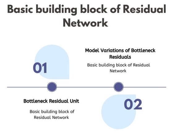 In 2015, a deep residual network (ResNet) was proposed by the authors in [] for image recognition. It is a type of convolutional neural network (CNN) where the input from the previous layer is added to the output of the current layer. This skip connection makes it easier for the network to learn and results in better performance. The ResNet architecture has been successful in a number of tasks, including image classification, object detection, and semantic segmentation. Additionally, since ResNets are made up of layers, these networks can be arbitrarily deep for an arbitrary level of spatial representation. There are various reasons for the success of the model: the large receptive fields that capture more information about each pixel in an image; the separation between the localization and classification stages; the computational efficiency at higher levels; the efficient encoding schemes with low-complexity arithmetic operations; and there is increased accuracy as features are extracted deeper into the network.