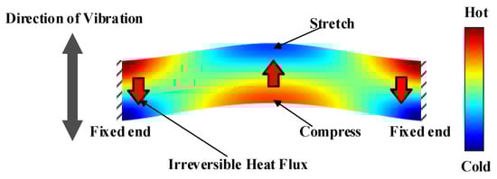 The thermoelastic damping is considered the dominant dissipative source in -level microstructures [6,35]. Thus, the design of thermoelastic damping is of importance for microstructures. Take a clamped-clamped microbeam resonator under a purely flexural vibration mode for example. As shown in Figure 1, the maximum strain occurred in the regions along the thickness of the beam. The temperature in the region decreased as one side of the beam stretched, whereas it increased as the other side was compressed. This phenomenon caused a temperature gradient along the thickness of the beam, which led to the irreversible heat flux along the temperature gradient direction, and thus energy was dissipated.