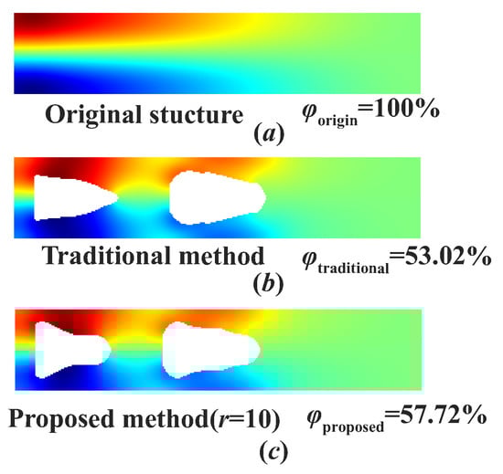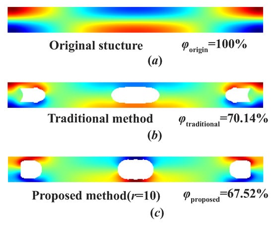 It can be observed in the optimized structure for the traditional method (Figure 6b) and the proposed method (Figure 6c) that the void regions near the clamped side and in the middle were quite alike, with some difference at the border.