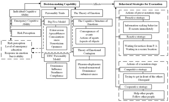A further review of the strategies of evacuation behaviour through the lens of other disciplines reveals that researchers have now focused on sociology, psychology, risk management and many other disciplines to explain evacuation behaviours [20]. As emergencies are often perceived as actual or anticipated threats and disruptions to the steady state of the organism, it is proposed that the decision-making capability in such situations is highly correlated with the cognitive ability [59]. Cognitive processes are considered necessary to generate behavioural decisions according to prevailing cognitive science. It works in conjunction with psychological or mental mechanisms in behaviour [60] and is a behavioural constraint [61] and interpretation [51] that needs to be considered in emergency management. As individuals perceive cues during emergencies, they interpret them and assess the situation to determine the behaviours to be taken [62]. However, emotions also encompass a person’s positive and negative reactions to events [63], which can influence behavioural decisions [64]. Analysis through post-disaster surveys has all shown that individuals may experience varying degrees of negative emotions during evacuation [65], accompanied by behaviours such as overwhelm, information seeking and shelter seeking [45]. This suggests that it is necessary to consider cognition and emotion when making predictions about evacuation behaviours [66]. In addition, the influence of personality on behavioural decision making has also been considered, which alongside emotions has been used to analyse the impact on behaviour to guide evacuation [23]. However, it did not seem to help to improve the simulation of evacuation situations [67]. In addition, numerous relevant evacuation studies have examined the influence of risk perception and familiarity with the space on evacuation behaviours, although a higher sense of security provided by the environment may cause more delay in evacuation initiation [30,68,69]. However, it is generally accepted that the greater the stock of emergency knowledge, the more rational the evacuation process is likely to be. As evacuation behavioural strategies have been studied, their influencing factors have been extracted in various research areas. This suggests that it is necessary to focus on and integrate the components that influence evacuation behaviours as proposed by these different studies within different fields to better predict evacuation behaviours.