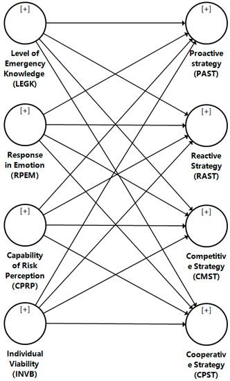 Finally, a holistic assessment of the structural model is also required based on the above assessment. The holistic evaluation is based on the PLS algorithm, the blindfolding algorithm and the bootstrapping algorithm. Figure 3 shows the final structural model based on the above operations. With the bootstrapping algorithm, Figure 3 shows the path coefficients with significance between the decision-making capacity and the evacuation behaviour strategies. In addition, the coefficient of determination R2 of the endogenous latent variable is assessed. R2 values were classified as strong, medium or weak by the three values of 0.75, 0.5 and 0.25 [80], whereby the R2 values for the four behavioural strategies can be considered to be quite large. On this basis, the relevance of the path model was evaluated with Blindfolding [80]. With the setting of omission distance = 7, the predictive correlation Q2 for all four behavioural strategies is greater than 0, suggesting that the measurement model is relevant to the predictive model. Additionally, the effect size of f2 in the model is reviewed by the PLS algorithm to measure the contribution of the measurement model to the R2 of the prediction model. The f2 values of 0.02, 0.15 and 0.35 indicate small, medium and large effects of exogenous latent variables on the values of endogenous latent variables in the structural model, respectively. The results show that the exogenous latent variables all contribute to the R2 of the endogenous variables to varying degrees, and therefore the proposed measurement model can explain the behavioural strategies in the evacuation process. It suggests that the structural model proposed in this study is scientific. Based on the above research, we present in Table 6 the following formulaic structural equations for pre-evacuation and evacuation behavioural strategies pre-evacuation and evacuation.