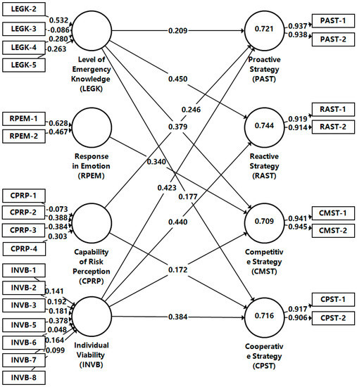 In addition, the indicators of the measurement model need to be assessed for relevance and importance. The results of the co-linearity assessment of the measurement model indicators utilizing the variance inflation factor (VIF) are shown in Table 5, where the maximum VIF value is 4.204 (INVB_5). The VIF values for all indicators are below the threshold of 5; thus, there is no co-linearity [81]. Furthermore, the analysis of the importance and relevance of the external weights of the measurement model indicators by the bootstrapping algorithm revealed that the indicators “INVB_4”, and “INVB_6” were not significant in terms of survivability and “LEGK_1” in terms of the level of emergency knowledge. As the external model loadings for these indicators are 0.132, 0.832 and −0.006, respectively, “INVB_4” and “LEGK_1” are excluded and “INVB_6” is retained, even though the external weights of this indicator are not significant [80]. Moreover, a review of the mean, standard deviation t-value and p-value of the path coefficients revealed that the path coefficients of emotion on active, cooperative and passive strategies were not significant, suggesting that the above exogenous latent variables do not have a significant effect on the endogenous latent variables.