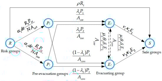 Therefore, this study proposes that the crowd state evolution relationship for the evacuation process is shown in Figure 4, and the main variables are described in Appendix A. Additionally, to simulate this evolutionary process, differential equations incorporating decision capabilities were constructed based on system dynamics and the model of epidemics.