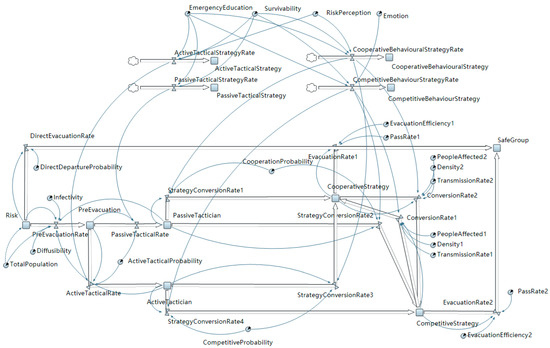 Combining the above assumptions, this study used the system dynamics analysis software module in Anylogic to construct an RPES model for metro platform evacuation based on decision-making capability, with the structure shown in Figure 5.