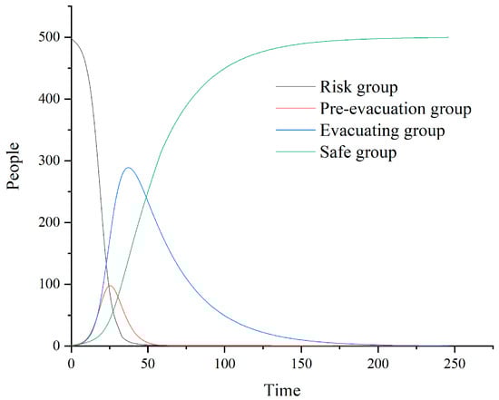 - The evacuation model is divided into four categories of groups: the population at risk, the pre-evacuation group, the group during evacuation and the safety group. The ratios of each group to the total population at time t are denoted as R(t), P(t), E(t) and S(t), respectively. The initial state has only the at-risk population and the pre-evacuation group, and when t = 0, E(t) = 0 and S(0) = 0.