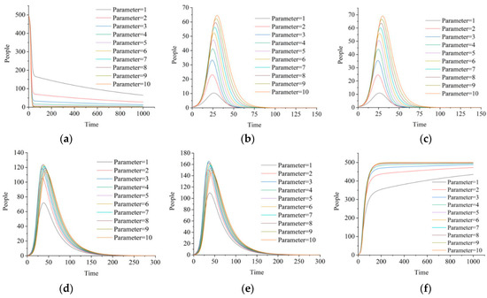 Following the model proposed in this study, assumptions are made about the parameters in the model and simulation studies are carried out based on this. The simulation experiment is as follows: Suppose there are 500 people on a metro platform, wherein in the initial state, the participant in 2 people adopt the active and passive strategies, respectively and propagate them. We assume that the diffusion rate of the evacuation message in the initial state is 1.25, the probability that passengers believe the evacuation message is true is 0.8, and the probability that passengers adopt different evacuation behaviour strategies is 0.5. In addition, passengers may transform between adopting cooperative and competitive strategies during the evacuation process; therefore, we assume that the crowd density during the evacuation process is 2.5 [83], and passengers who adopt competitive strategies can influence 1.5 surrounding passengers with a cooperative strategy with an effective probability of 0.6. Conversely, a passenger with a cooperative strategy can influence 2 surrounding passengers with a competitive strategy with an effective probability of 0.8. Assuming an exit throughput rate of 50 passengers/second, the impact of a passenger with a cooperative strategy and a passenger with a competitive strategy on evacuation efficiency is 1.3 and 0.8, respectively. The variation of the number of people in each group over time was obtained by substituting each parameter into the differential equation and the system dynamics model, as shown in Figure 6. To further determine the relationship between evacuation efficiency and decision-making capacity and to explore the quality of the model constructed in this study [84,85], sensitivity analysis was conducted on four parameters, Emotion, Emergency Education, Survivability, Risk Perception, where MIN (Emergency Education, Survivability, Risk Perception, Emotion) = 1, MAX (Emergency Education, Survivability, Risk Perception, Emotion) = 10, and step size = 1. The change in the number of people in each group in the model is shown in Figure 7 below.