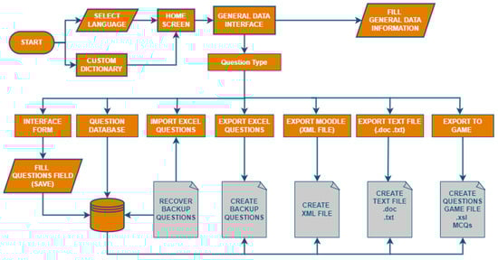 Figure 1 shows the architecture of FastTest PlugIn. Firstly, the language has to be selected. Then, the home interface displays general information of the plugin and allows the user to access to the general data interface. This interface is used to fill the common data for all the question types. Additionally, the user must select the question type to open its corresponding form and develop the questions. After creating all the questions, the user can carry out several actions: import/export the questions from/to an Excel backup file, export the questions to a XML file (to be imported in Moodle later), export the questions in a text file that can be printed in paper tests and export the multiple option questions to an Android game called “Cauchy App” (