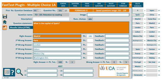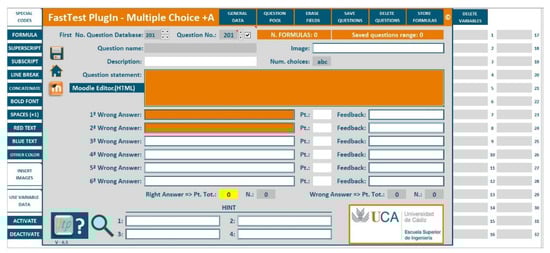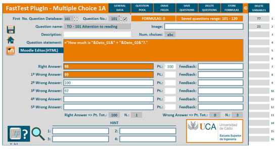 FastTest PlugIn and Moodle2Word are the most complete plugins for importing questions into Moodle. Both require additional commercial software, but FastTest PlugIn does not require installation in Moodle. In addition, questions can be grouped by topic, difficulty, etc., in FastTest PlugIn. The user can store questions in an Excel file, grouped by course, in case there is a need to reuse them in future. Finally, since FastTest PlugIn is based on an Excel spreadsheet, it has all the advantages of this commercial software in terms of its calculation power. Parameterised questions can be defined using all of Excel’s functions, and this is a great advantage of FastTest PlugIn because it provides a process to include a large quantity of questions automatically, mitigating the limitations detected in the carried-out literature review.