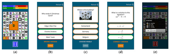 Figure 7a, up to four players can take part, and each player needs to roll the dice to move a piece. They are presented with a random question from a bank of questions, with up to six levels of difficulty. In addition, MCQs can be created in different formats: text only (