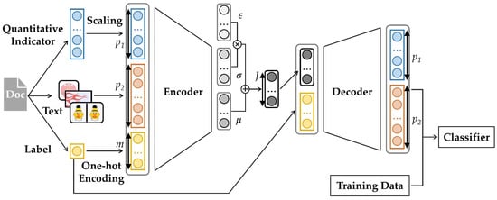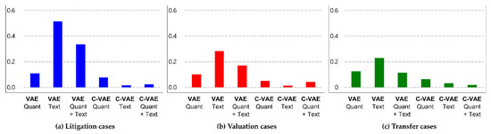 Figure A1 in Appendix A summarizes the architecture of used in this paper. In the experiment, we defined the dimension of the latent space of as 2 for the statistical test of Hypothesis 2. The design of the statistical test for Hypothesis 2 is as follows. First, the latent space of is divided into two-dimensional and , respectively. However, the general Kolmogorov–Smirnov test deals with the homogeneity of the distribution of one-dimensional data. Therefore, the general Kolmogorov–Smirnov test and the multidimensional version of the Kolmogorov–Smirnov test [73,74] are applied depending on the dimensions of the latent vector. Then, we can determine whether the latent space for each condition is disentangled through statistical hypothesis testing. Since the latent variables are not entangled in , only data belonging to a specific label can be generated. Furthermore, we conducted experiments depending on the types of predictors and generative models to compare their results. In Table 4, Quant and Text are the results of using only quantitative indicators and text of documents, respectively. In addition, VAE refers to a generative model that does not assume conditions for a specific label in C-VAE.