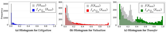 Distribution of the prediction probability for the target variables (when the generative model was C-VAE and the predictors were quantitative indicators and text of documents). (a) This figure shows the distribution of the prediction probabilities when the target variable was Litigation, which shows that the overall likelihood increased when the proposed method was used; (b) predicted distribution when the target variable was Valuation: this figure shows that the probability increases by 0.4 or more; (c) predicted distribution when the target variable is Transfer: it shows a similar pattern to the distribution in (b).