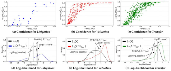 The purpose of this subsection is to verify that the proposed method can calibrate the confidence of document classification through experiments on Hypothesis 3. For this, we generate times the data labeled and merge it with the training data. The optimal value of was determined as shown in Appendix B. Table A1 in Appendix B compares the prediction performance obtained using the proposed method. The optimal values of are 1.5, 1.3, and 2.0 for cases where the target variables are Litigation, Valuation, and Transfer, respectively. For example, when the target variable is Valuation, the optimal value of is 1.3. When the target variable is Valuation, there were 566 and 5015 observations with labels Y and N in the training data, respectively. Using Equation (2), generated 5954 observations whose label is Y. When raw data and generated data were concatenated, the number of observations with label Y became 6520. That is, the labels in the data augmented through the proposed method had a Y:N ratio of 1.3 (=optimal value of ).