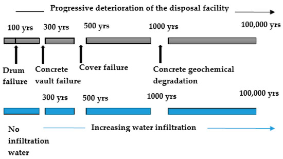 - International Atomic Energy Agency. Technical Considerations in the Design of Near Surface Disposal Facilities for Radioactive Waste; International Atomic Energy Agency: Vienna, Austria, 2001; pp. 6–9. [Google Scholar]