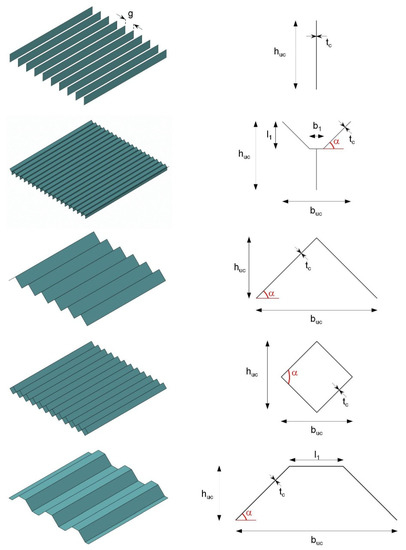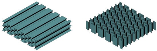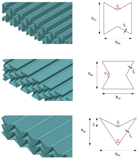Open prismatic cores form a related class of core topology. The extrusion direction of the underlying unit cells is located parallel to the cover surfaces, resulting in core designs that are open on one side. The core geometries shown in Figure 4 are widely used in such cases; in principle, the same geometry parameters used for their closed counterparts can be used to adjust their mechanical properties. Extensive studies have already been conducted on this core group to determine their mechanical behavior in different loading situations.