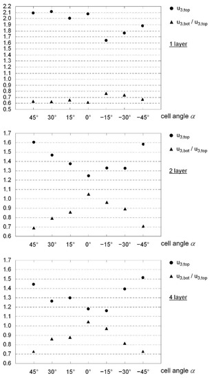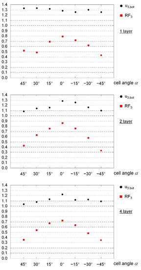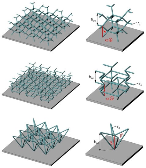 Since finite-element-based simulations of complex core structures are very computationally expensive in terms of time and CPU capacity, the number of topologies considered in this contribution had to be limited. For this reason, a direct comparison with the previously described variants is not possible for the lattice cores. Rather, the focus here is on a subset of the novel cell geometries shown in Figure 8. The uppermost topology corresponds to the equivalent of a three-dimensional honeycomb cell and is characterized by positive values of the lattice cell angle . With , cube-shaped cells without inclined cell components are created. A three-dimensional auxetic structure results, with a value of in the negative value range (Figure 8, center). Here, a compression in one of the three spatial directions also leads to a contraction of the cell in the two remaining directions. Slight modifications transform the conventional pyramidal geometry into a potentially auxetic structure (Figure 8, below). A central compressive load (such as one that occurs in a multi-layer structure) also tends to cause a contraction in the surface directions.