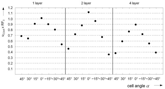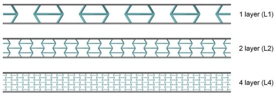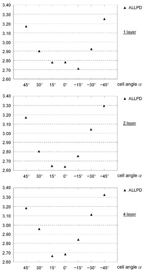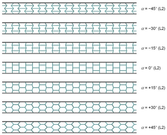 Since the auxetic and non-auxetic 3D honeycomb unit cells are, in principle, based on the same basic generating model, Table 4 summarizes both variants. As can be seen from Figure 8, negative angles describe the auxetic and positive angles the non-auxetic variants. With , a conventional cube structure is created. Figure 9 shows side views for single- and multi-layer structures. Figure 10 illustrates the cell shape changes with variations in the grid cell angle .