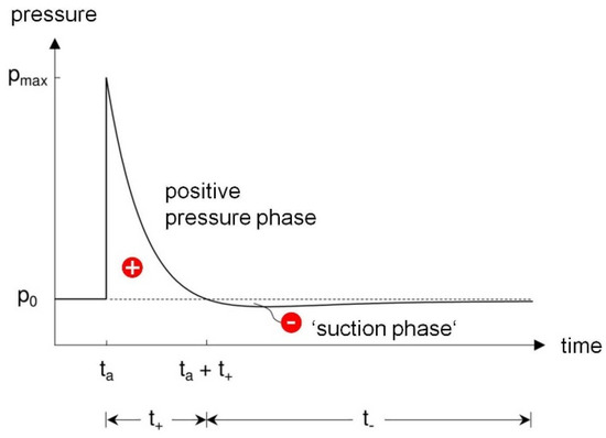 At a fixed point in space, the pressure increases abruptly from the ambient pressure to the peak pressure (overpressure) when the pressure front () arrives; then, it decreases exponentially. A positive pressure phase is followed—due to the inertia of the air—by a drop in pressure below the ambient pressure, the so-called suction phase. The duration of the positive phase is designated by and is only a few milliseconds (the main part of the load is usually only tenths of a millisecond). The parameter describes a dimensionless decay coefficient. Figure 11 shows the characteristic pressure–time curve for wave propagation in the free field.
