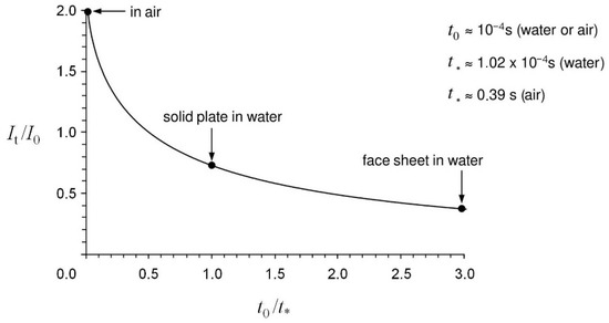 Figure 12 provides simple interpretations for the two limits and . Massive plates that are hardly set in motion by the (free-field) momentum () generally ensure an almost perfect rebound of the impacting pressure wave () so that the final force impact exerted on the plate is approximately . In general, the influence of the structure on the fluid movement decreases with decreasing plate thickness. In the limiting case of vanishing thickness, the plate acquires the velocity of the fluid and, like a free surface, experiences no momentum load. The significant effects of the ambient medium and the plate thickness on the transmitted momentum result from the specific time variable relationships. For a homogeneous plate in water, a value of results in a transmitted momentum of about . In contrast, with the distribution of the total plate mass that is possible for sandwich construction plates with correspondingly thin cover layers, significantly reduced momentum loads can be achieved. For example, with a mass distribution of one-third each for the upper cover surface, the core, and the bottom cover surface, the corresponding cover surface is only hit by a force impact of approximately (). In the case of structures subjected to air-blast loading, this advantage is essentially non-existent due to the low density of the fluid. In that case, both a solid plate and a sandwich structure experience impulse changes of almost since the times of decay and fluid–structure interaction differ by several orders of magnitude, and a change in the thickness ratios has no significant effect.