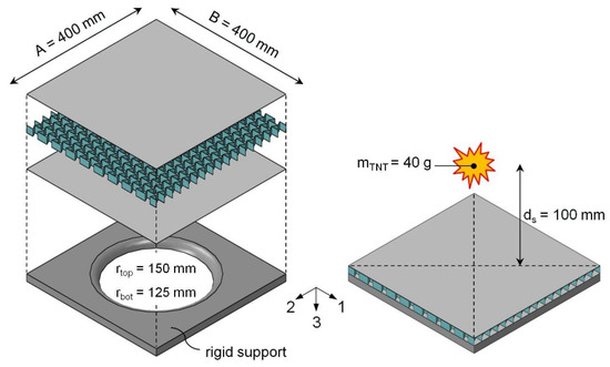 Increasing requirements concerning environmental impact, product quality, and security lead to new challenges for lightweight design [1,2,3,4]. In particular, the thrust towards renewable energy and the expansion of electro-mobility encourage novel trends in the development of materials and multi-functional structures. In this context, the stability of material structures (e.g., body frames [5] and battery-pack enclosures [6]) subjected to dynamic loading regimes attracts increasing interest. For this reason, the present contribution puts a special focus on the blast resistance of lightweight structures. Numerous studies have demonstrated the improved performance of structural components based on sandwich-structured composites in the case of blast loading due to detonation processes (in water or air) compared to monolithic panels of the same weight [7,8,9,10]. This superiority is expressed both in the lower level of deflection with respect to the rear face and in the reduction in the forces transmitted to the substructure. The main reasons for this enhanced blast resistance are the increase in energy dissipation due to plastic deformations of the core and the top surfaces, as well as—mainly in the case of underwater explosions—a reduction in the momentum introduced into the structure due to fluid–structure interactions.