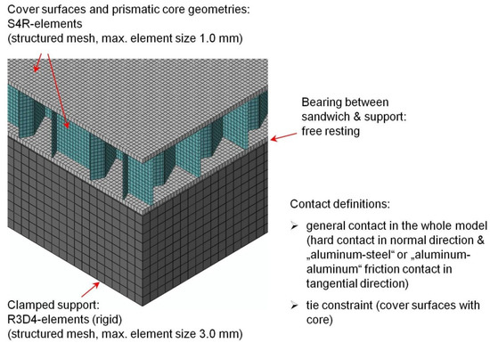 A blast loading above the support structure serves as the load source. Measured from each upper edge, the point of ignition is located at a distance of 100 mm centrally above the alternating test structures (i.e., the different core topologies). The TNT equivalent of the explosive charge is 40 g. The support is free from any kind of constraints in the sense that the sandwich structure lies loosely and directly on the supporting structure and is free in its translational and rotational movements throughout the simulation. A restriction of movement exists only due to the contact conditions. The ABAQUS/Explicit general contact conditions prevail throughout the model (hard contact in the normal direction and “aluminum–steel” or “aluminum–friction” contact in the tangential direction). However, all components of the sandwich structure can come into mutual contact. Besides this internal contact, interaction between the overall sandwich structure and the support is also ensured. The support is modeled as a rigid body whose degrees of freedom are locked in all directions.
