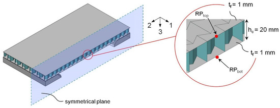 Due to the high level of numerical effort involved, some authors refrain from an exact modeling of resolved core structures and describe their behaviors with the help of homogenization techniques [13,14,15]. Such continuum mechanical approaches inevitably lead to simplified representations of the relevant behaviors and failure mechanisms, with an associated loss of accuracy. For example, these approaches cannot capture local (buckling) phenomena over the core height or their influence on overall structural behavior. In addition, the homogenized input parameters of any core variants must be determined and calibrated at great expense, either by means of experimental data or detailed mapped and meshed unit cells.