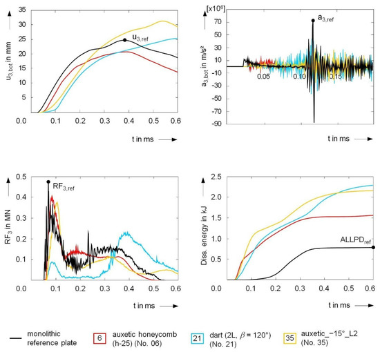 serves as a time scale factor characterizing the fluid–structure interaction. It strongly depends on the properties of the ambient fluid and the plate. Therefore, in Equation (4), and h denote the density and thickness of the plate, respectively. is the density of the fluid on the impact side, and the speed of sound of the fluid. The decay time of the positive pressure phase is denoted by . Figure 12 shows the momentum ratio as a function of q, as well as the representative temporal magnitudes for a homogeneous steel plate of thickness h = 0.0254 m. See also [67].
