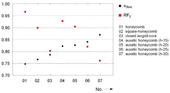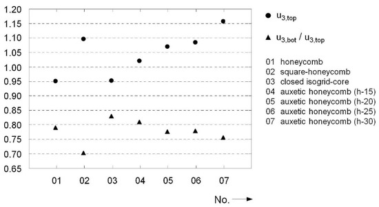 The primary goal of being able to evaluate and compare numerous core topologies without an increased standardization effort led to the definition of some constant geometry parameters for all sandwich configurations in the run-up to the simulations. In addition to the fixed thickness of the face sheets, equal lateral dimensions and a constant core height were also set for all configurations. Furthermore, a constant relative density was set for all core variants; consequently, identical weights for all constructions were guaranteed. On this basis, an initial efficiency evaluation and assessment of the performance of the auxetic cores compared to conventional variants can be made according to the simulation results.
